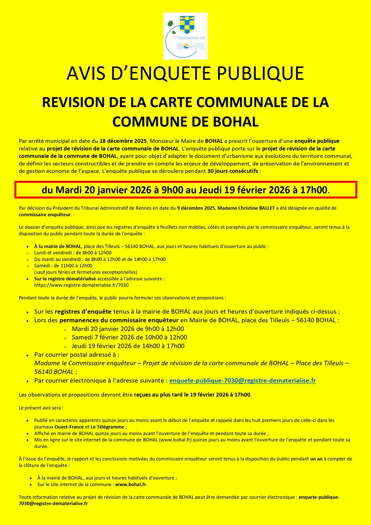 Avis enquete publiquev2Télécharger La commune de Bohal organise une enquête publique concernant le projet de…