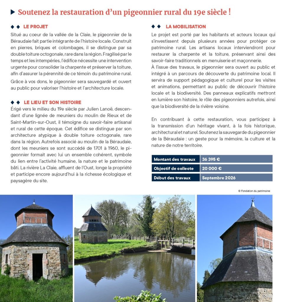 Véritable témoin de l’histoire rurale de Bohal, le pigeonnier de la Béraudaie est aujourd’hui fragilisé par le temps. Avec sa silhouette unique et sa double toiture octogonale, il fait partie de l’identité de notre commune et de notre patrimoine commun.
